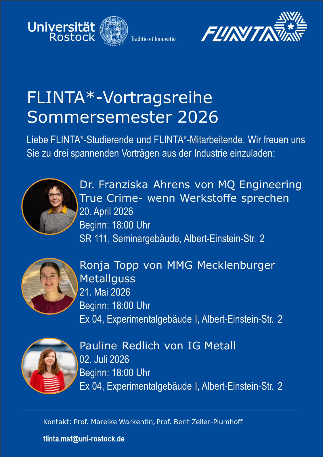 Liebe FLINTA*- Studierende und FLINTA* Mitarbeitende der MSF. Wir freuen uns, Sie zu drei spannenden Vorträgen aus der Industrie einzuladen: